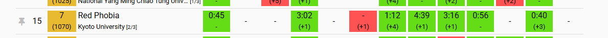 yumaがCでハマっているのをkumaがヘルプに回っている間、Jの考察が生えたので実装する。3通り以上の場合分けを経て提出。WA。この80分間で中盤枠が1問も通らない非常にまずい状態になった。去年のKUB1と似たような状況でかなり焦る。