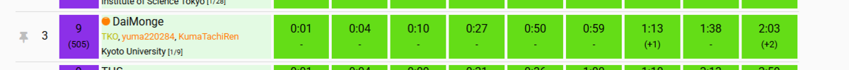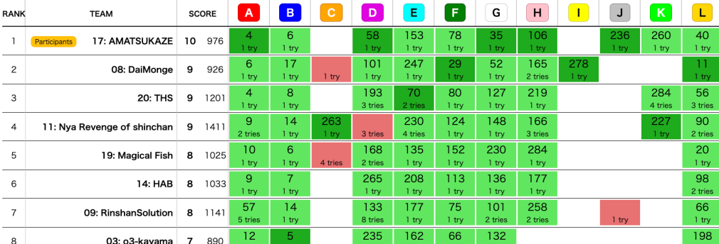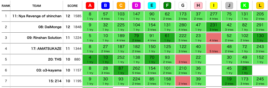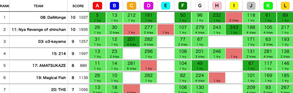 少し経った後kumaがJのコーナーに気付き、そのまま書き直してもらい通った(すみません)。直後にCのバグが判明しようやくAC。この2問が通る前は13位とかだったらしい。本当に助けて欲しい。